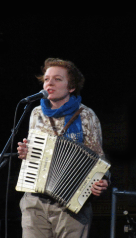 Ironic, then, that Anna and Grace seem so untouched by time themselves. Edging towards their thirties, each woman still looks and acts like the half of the undergraduate duo they once were. Anna – pencil-slender, blinking and beaming through her glasses as she pecks happily away at her guitar – is the spit’n’archetype of the bohemian homespinner: all thrift-shop ingenuity, universally adored. Keying the accordion while punctuating the songs with delicate frowns and bursts of baffled humour, Grace is her unlikely travelling companion: the Thirties screen-queen lookalike, the one who’d frankly rather be Anna’s kind of bohemian. All of this might be camouflage for those keen songwriting minds – but I think not. For all of their onstage bumps and stumbles, they seem so comfortable in their skins that I can’t see it as anything other than genuine. They’re the odd couple who turn out to be the natural couple. They’ve come a long way. I can imagine them still travelling it, still chuckling along it, in fifty years time, with purple ribbons threaded into the accordion.