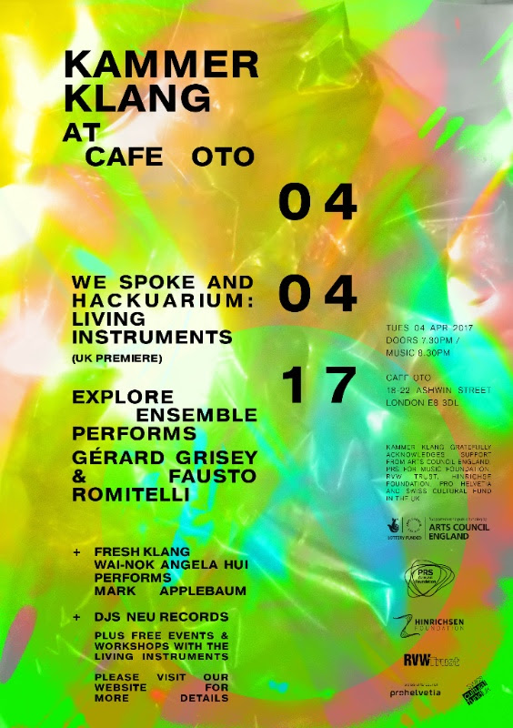 - Kammer Klang (We Spoke & Living Instruments + Explore Ensemble + Wai-Nok Angela Hui)- Café Oto, 18-22 Ashwin Street, Dalston, London, E8 3DL, England, Tuesday 4th April 2017, 7.30pm – information here and here