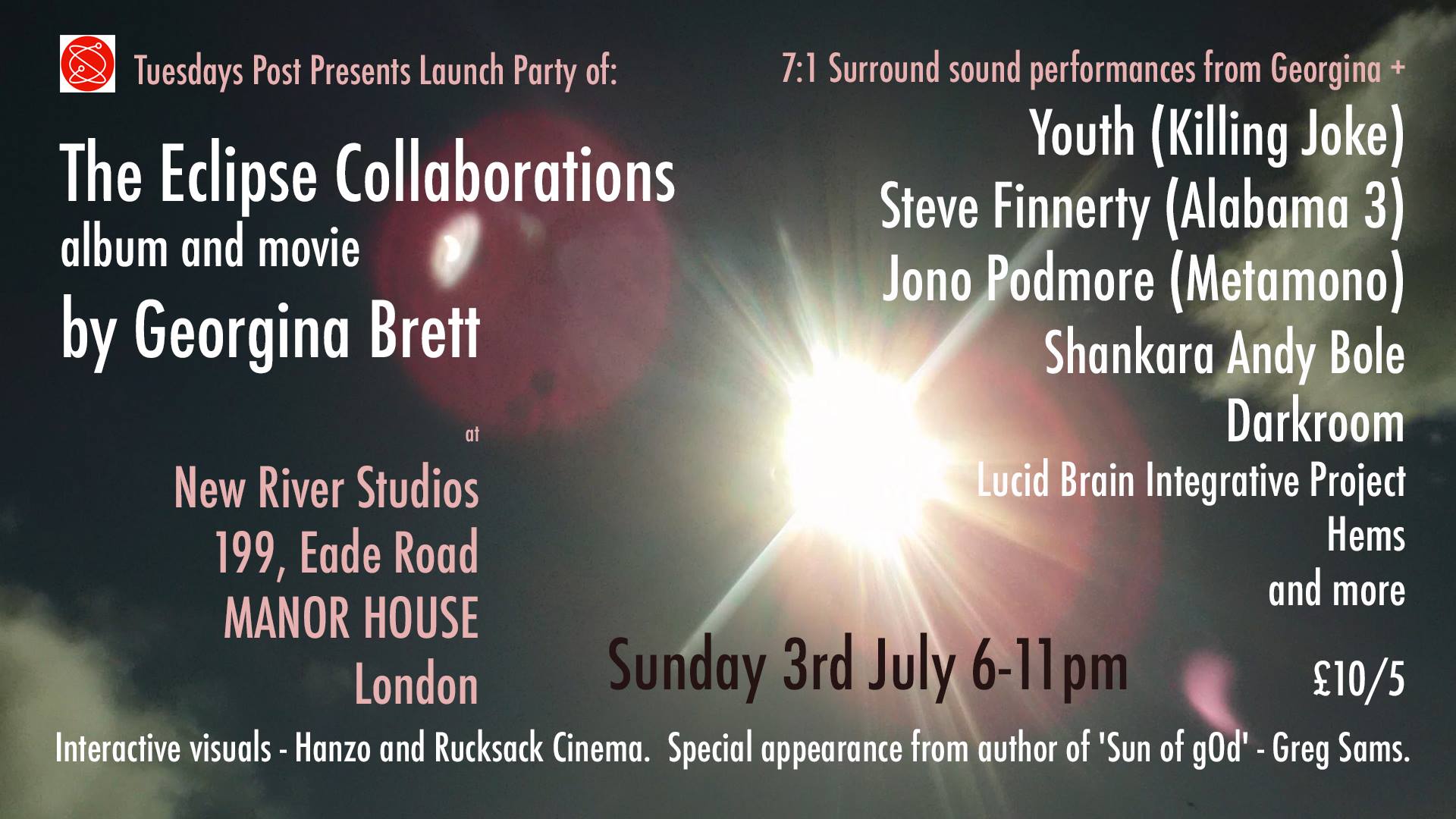 ‘The Eclipse Collaborations’ is a thirty-minute video accompanying voice-looper Georgina Brett‘s new album. Although the video made its formal debut when it was played online and transnationally back in June (as part of the 2016 Solstice event) the formal launch party is taking place at New River Studios (the new home for Georgina’s ambient/progressive Tuesday’s Post night). It includes a full screening of the video, a bar and DJs, interactive visuals provided by Tuesday’s Post regulars Hanzo and Rucksack Cinema, and an appearance by speculative writer Greg Sams (who amongst other things has presented the idea that our sun is a “conscious, providing entity…”).