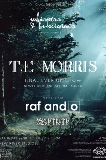 “This edition of Whispers & Hurricanes is a very special one indeed, as T.E. Morris joins us at for his last ever UK solo show, and simultaneously/belatedly launches his fourth and final full-length solo album ‘Newfoundland’. As the multi-instrumentalist, vocalist and songwriter behind critically acclaimed cult post-rock band Her Name Is Calla (with a career spanning well over a decade, extensive tours across Europe alongside such renowned acts as R.M. Hubbert and Willy Mason) he has more than twenty releases to his name, including soundtracks for film and novel, and television credits with Warp Films. Following ‘Newfoundland’ (out via Robot Needs Home Recordings) he’ll be turning his focus to new creative endeavours and future commitments with Her Name Is Calla.